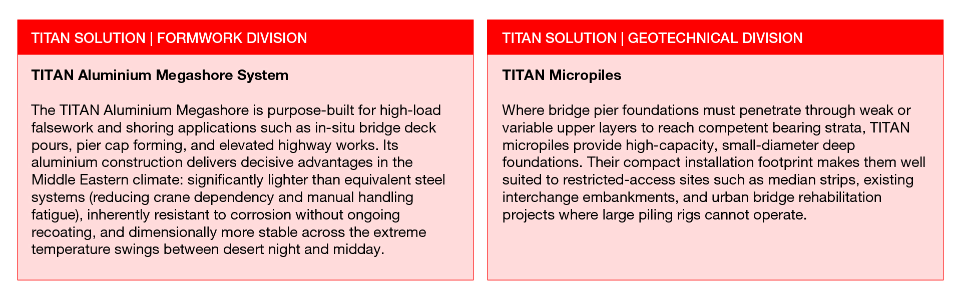 What sets Ischebeck TITAN apart in the Middle East market is not any single product, but the integration of three complementary engineering divisions under one roof. A bridge project does not face only a geotechnical challenge or only a formwork challenge; it faces both simultaneously, under pressure.